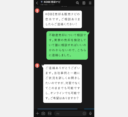 KOBE売却&買取ナビなら、LINEでの無料相談を24時間いつでも受け付けています。面倒な手続きや複雑な入力は不要!お名前を明かさずに気軽にご相談いただけるので、不安なくご利用いただけます。また、ご相談内容を外部に漏らすことは一切ありません。回数制限なし!納得いくまで相談可能!何度でも無料でご相談いただけるので、納得いくまで安心してお話しください。